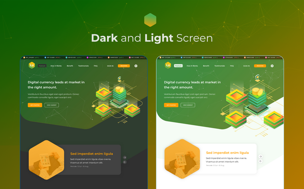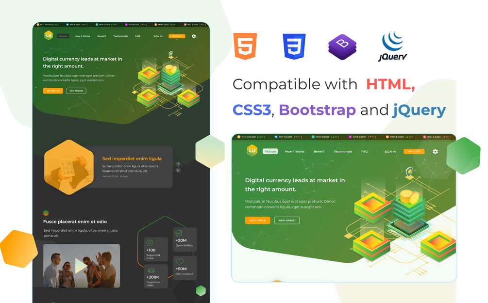 Website theme for Bitcoin, Blockchain, Cryptocurrency, ICO Agency, Financial Technology, Fintech Service, Crypto coins, cryptocurrency trading, digital wallet, ICO, or fintech and other financial business. Considering the growing cryptocurrencies and digital assets, this design is suitable for who need an attractive design and powerful background management for your digital assets.